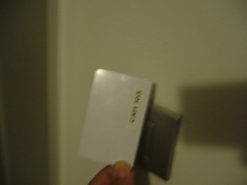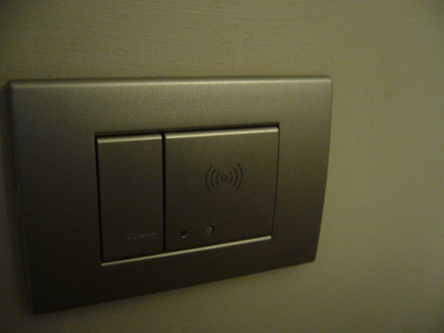 ประตูเข้าห้องตั้งแต่ หน้าประตูใหญ่ จนถึงห้องเรา เค้าจะใช้ การ์ดสีขาวธรรมดา ไม่มีแถบอะไรเลยนะให้วางไว้บนป้ายที่เราถ่ายรูปมาให้ดู ทีแรกจะมีไฟแดงอยู่ แต่พอเอาการ์ดมาวาง ไฟเขียวก็จะขึ้นมา แล้วก็เปิดเข้าห้องได้เลย ทันสมัยมากๆ ไม่เคยเห็น แหะๆ
