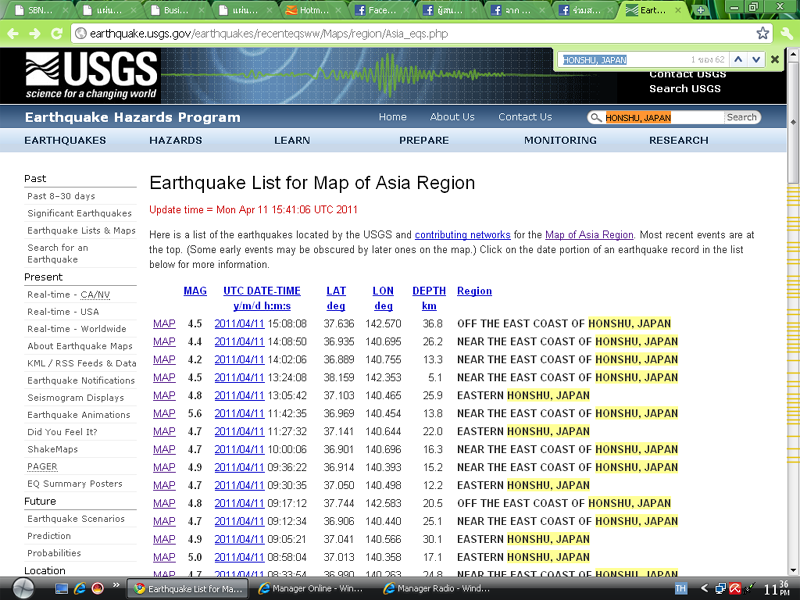 ตั้งแต่วันที่ 11เป็นต้นมาเกิดแผ่นดินไหวระดับเกิน 6 ริกเตอร์ ทุกวัน ที่ตำแหน่ง HONSHU, JAPAN