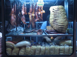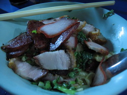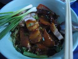 ที่ช่วยให้เราตัดสินใจกินร้านนี้ นี่เลยครับ ลองดูที่ตู้กระจกซิครับ หมูแดง หมูกรอบ เห็นแล้ว น้ำลายไหล แถมด้วยกุนเชียงนะครับ เส้นบะหมี่ เต็มตู้เลยครับ เส้นอื่นๆ มีน้อยหน่อยนะครับ เขาเน้นเส้นบะหมี่น่ะครับ