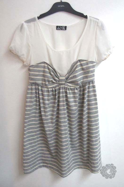 เสื้อตัวยาวผ้ายืดลายจุดเทา ปกลูกไม้ 250.-