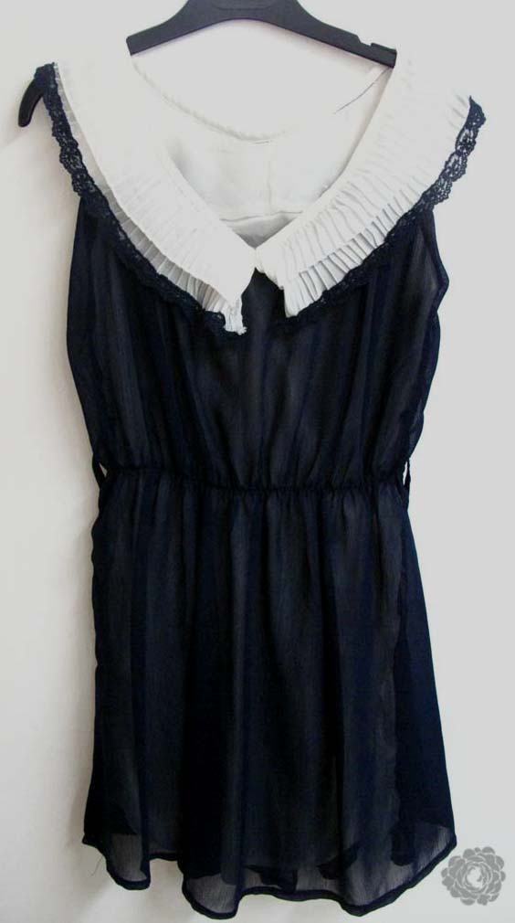 เสื้อตัวยาวผ้ายืดลายจุดขาวดำ ปกลูกไม้ 250.-