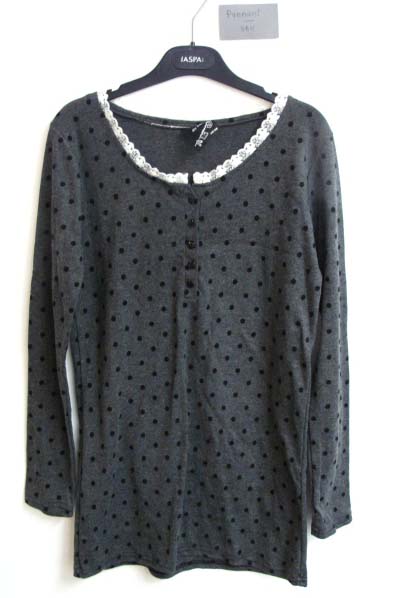 เสื้อตัวยาวผ้ายืดลายจุดเทา ปกลูกไม้ 250.-