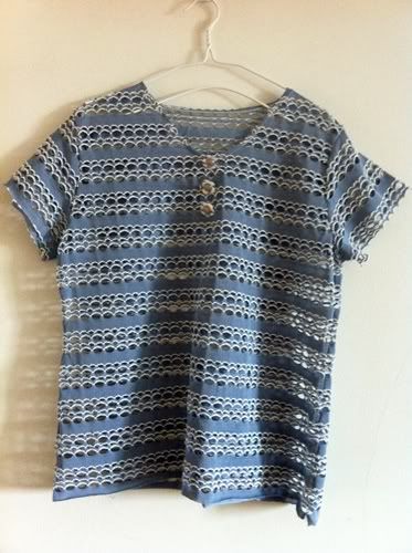 เสื้อแขนสั้นสีฟ้า แต่งเป็นรูทั้งตัว ขาย 150 บาท