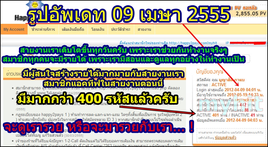 11. ธุรกิจออนไลน์ happy2pays เพิ่งเปิดตัว 07 มีนาคม 2555 เท่านั้น โอกาสเติบโตยังมีอีกมาก และกว้างไกลครับ