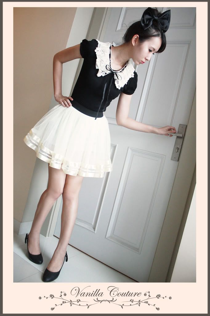 Detail : เสื้อผ้ายืดสีดำประดับด้วยปก2ชั้น ปกด้านในผ้าชีฟองอัดพรีท ด้านนอกเป็นลูกไม้ทำให้เสื้อธรรมดาๆกลายเป็นลุคคุณหนูขึ้นมาทันที ยิ่งแมทช์กับกระโปรงบานเอวสูงผ้าชีฟองด้วยเนี่ย ถึงกับว้าววววว
